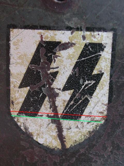 Come ha detto Drapponero,è difficile dare un giudizio da fotografie a causa delle condizioni della decal,comunque ,sembra che la parte bassa della runa di sinistra finisca all'altezza del punto di curvatura dello scudo ,e per questo motivo, sono più propenso a pensare che la decal sia una SE .Unico dubbio in questo caso ,è la punta della decal che sembra un pizzico più arrotondata,ma probabilmente è un effetto dovuto all'usura.