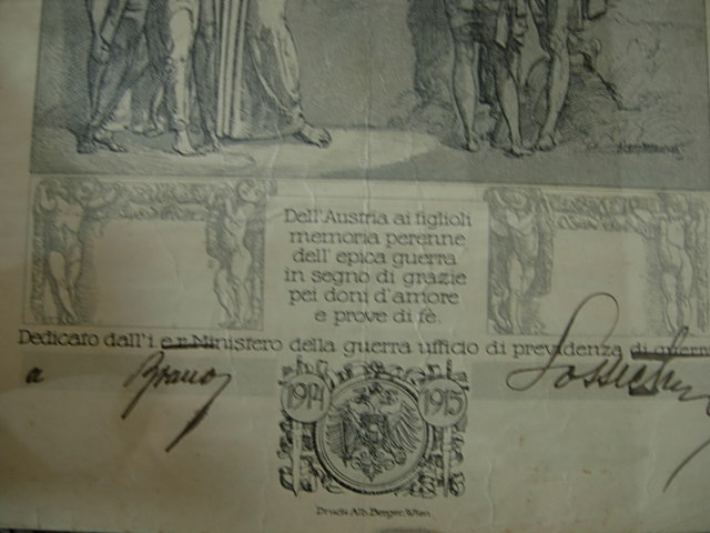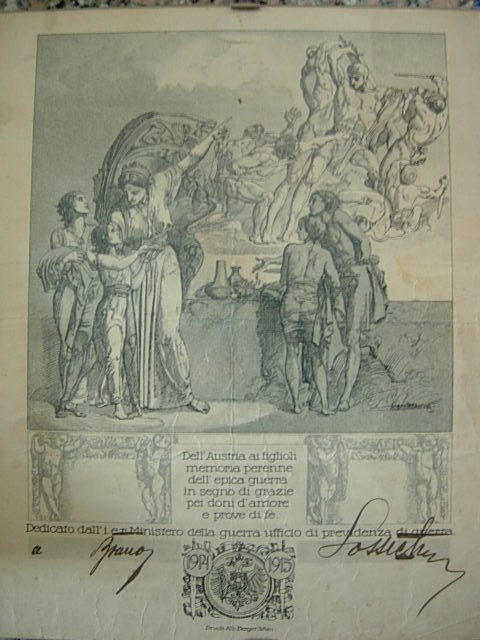 L'altra domenica ho comperato questo attestato rilasciato ad un cittadino asburgico, di lingua italiana, dall' i.e r. Ministero della guerra per una donazione effettuata per sostenere l'Austria nello sforzo del 1^ anno di guerra.