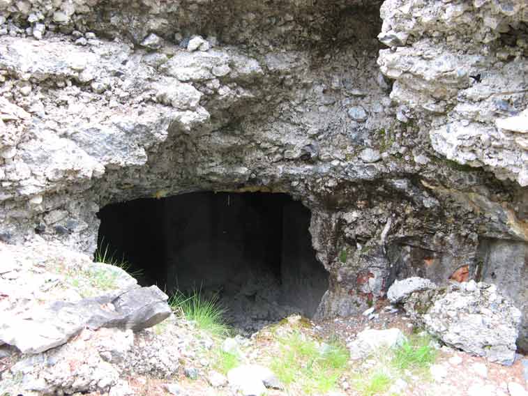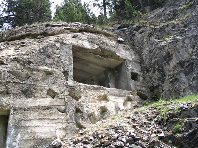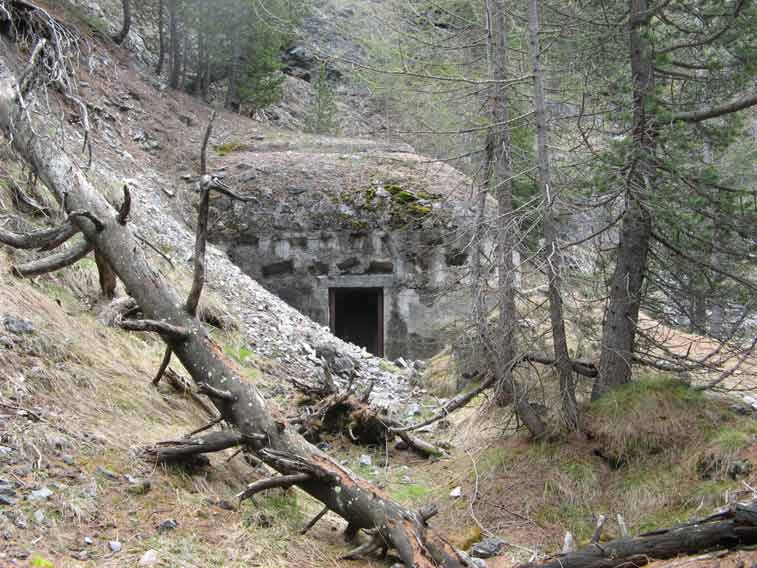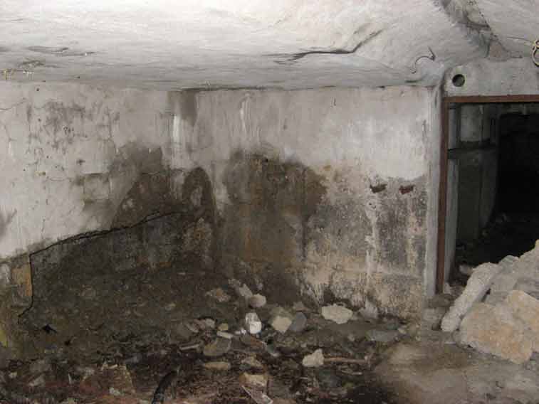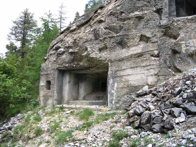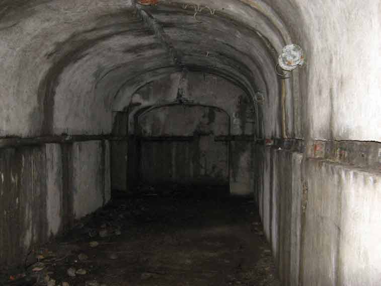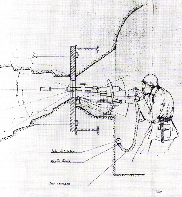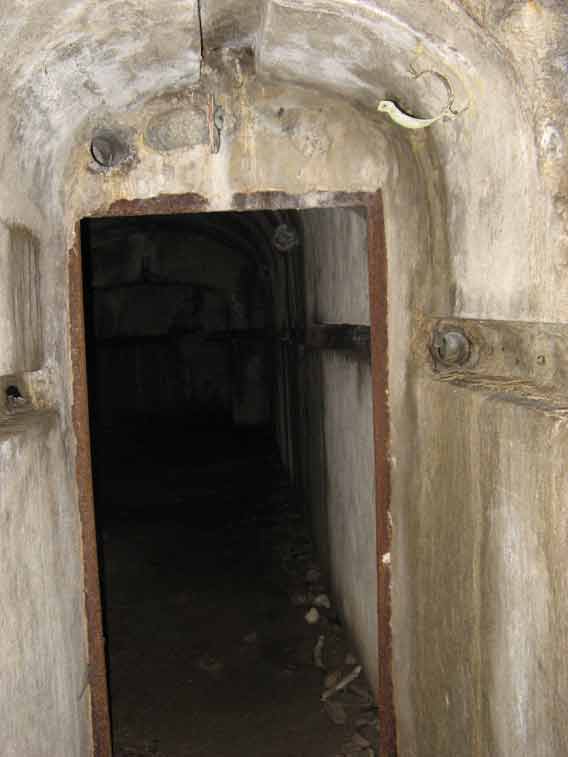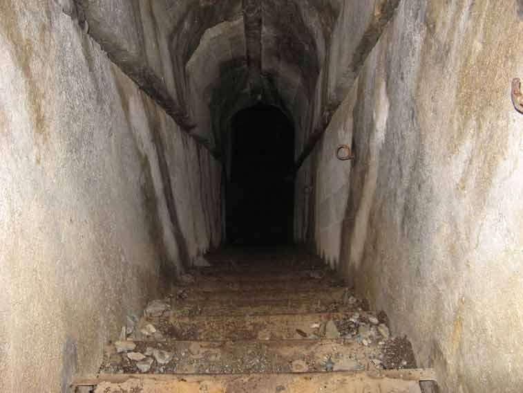 Oltrepassato il gruppo elettrogeno una porta stagna(da questo punto in avanti inizia la parte in caverna dell`opera)ci immette in un corridoio che conduce al vano dei serbatoi della riserva d`acqua e al ricovero del personale.In fondo a questo troviamo a sx il vano destinato a contenere l`apparecchiatura per la ventilazione e a dx la derivazione,che dopo aver superato 2 porte stagne e il vano della riservetta munizioni delle mitragliatrici ci conduce alla base della scala di 21 gradini che conduce all`interno del malloppo delle mitragliatrici.Troviamo subito la casamatta dell`Arma A1 e a sx di questa una botola che con una scala metallica alla marinara ci consentirà* di salire alla casamatta dell`arma A2.Non essendo presenti altri ingressi o uscite di emergenza ripercorreremo il percorso a ritroso ritornando all`ingresso.