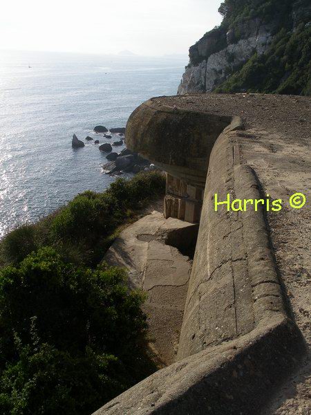 Passiamo ora a visitare la batteria "alta" (n. 2 della pianta) cui si accede tramite la scalinata già* vista: non stupisca la mancanza di una strada che sarebbe stata troppo esposta all`offesa: il rifornimento delle munizioni avveniva attraverso il camminamento sotterraneo –poterna- (n. 5 della pianta)
