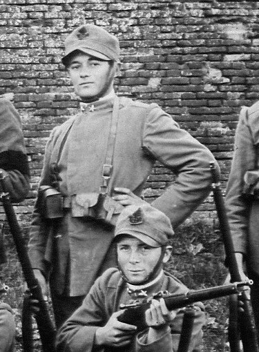 Invio un particolare di un gruppetto di militari armati. Sono privi di mostrine al bavero e sul berretto portano un fregio in filo nero con cornetta, fiamma verticale e croce savoia al centro. Nella documentazione in mio possesso non mi è stato possibile trovare nulla del genere tranne che sul testo: "Soldati del regno" di E.Cernigoi, pag.111 dove un fregio pressochè identico è attribuito alla Finanza, circa la quale non ho alcuna documentazione...