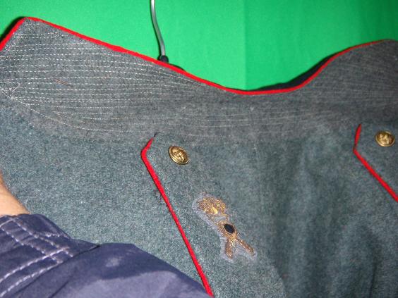si direbbe una giubba da truppa "trasformata" ad una per ufficiale ancora nel periodo prebellico quando, cioè, il colletto era nero filettato di rosso come lo erano i paramani e le controspalline...