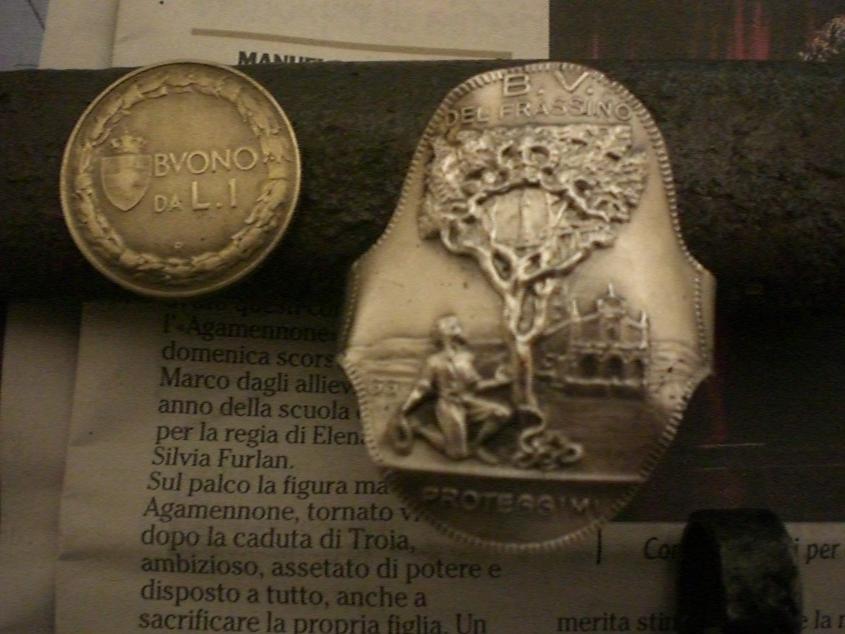 una moneta BUONO DA 1 LIRA del 1922 e una medaglia votiva