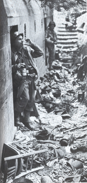 Pensando di farti casa gradita ti posto questa foto dove verso il centro per terra vicino l'elmetto e vicino alla cartuccia del filtro c'è una gas masck con ritengo la sacca (gasplane) come la tua prima postata. [ciao2]