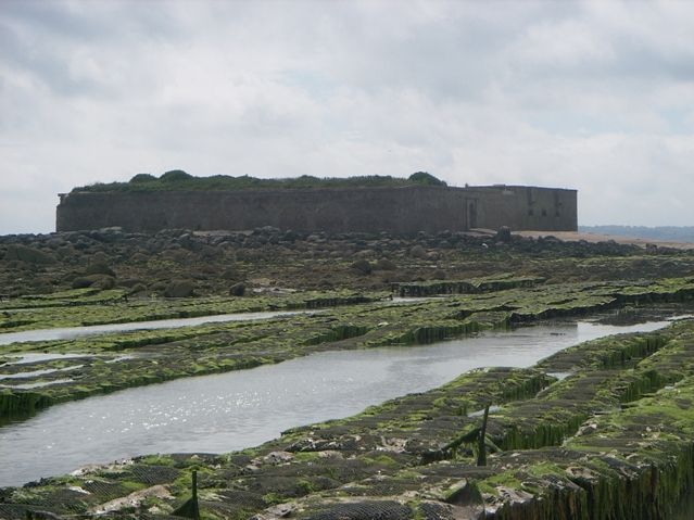 ...il faro ed il forte visti da dove un'ora dopo l'acqua imperava!!!Notate gli allevamenti di cozze(mascherate dalle alghe)e di ostriche(in quei cestelli tubolari)...
