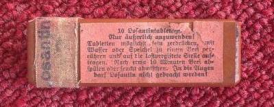 2: Hautengistungmittel tubetto di pasta sterilizzante da usare per pulire l'interno ed l'esterno in particolare della maschera dopo un eventuale attacco con gas :ci sono vari tipi di contenuto in base al colore del nastro che li sigilla qui di colore rosso