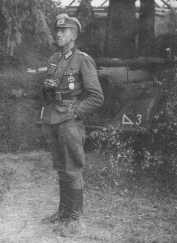 Meno nitida ma interessante quest'altra immagine che ritrae un elegante ed impettito ufficiale in servizio presso la terza batteria del 37° Battaglione motorizzato anticarro della 1a Panzer Division. Ho un debole per le foto dove si vedono le insegne di reparto, come quelle sul parafango della Horch Kf 15 in secondo piano.