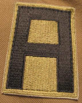 Vorrei anche che si parlasse un po' della patch della 1st Army, a quanto su questa regna in generale un po' di confusione; a quanto ne so io ne esistono 4 modelli più alcune varianti risalenti alla 1GM e 2GM, la prima, nata durante la IGM e in uso anche durante la 2GM, con la A in nero e lo sfondo in un marroncino: