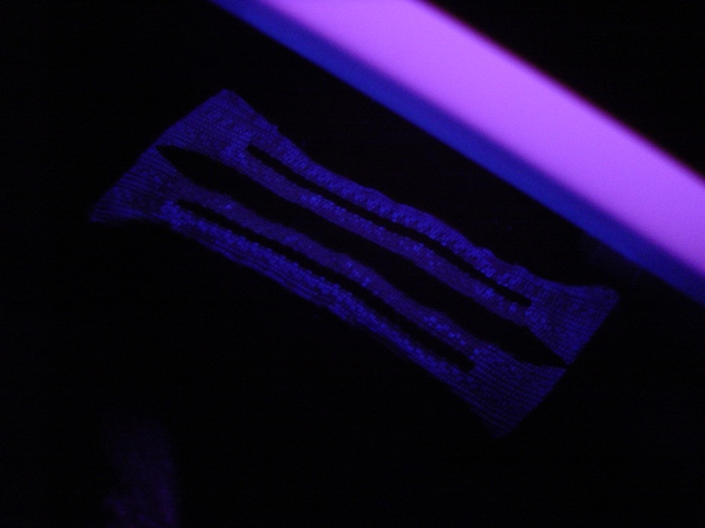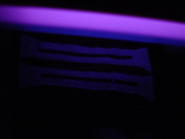 Guardate bene queste due foto che ora vado a inserire.Ho fotografato la giacca al buio,illuminata solo dalla lampada Wood.Bene,il risultato è sensazionale....la falsa "brilla",l'altra no!