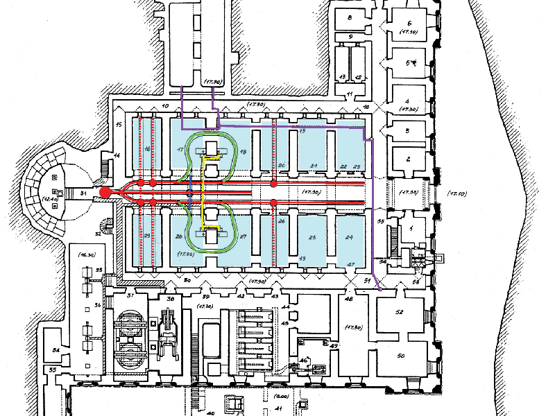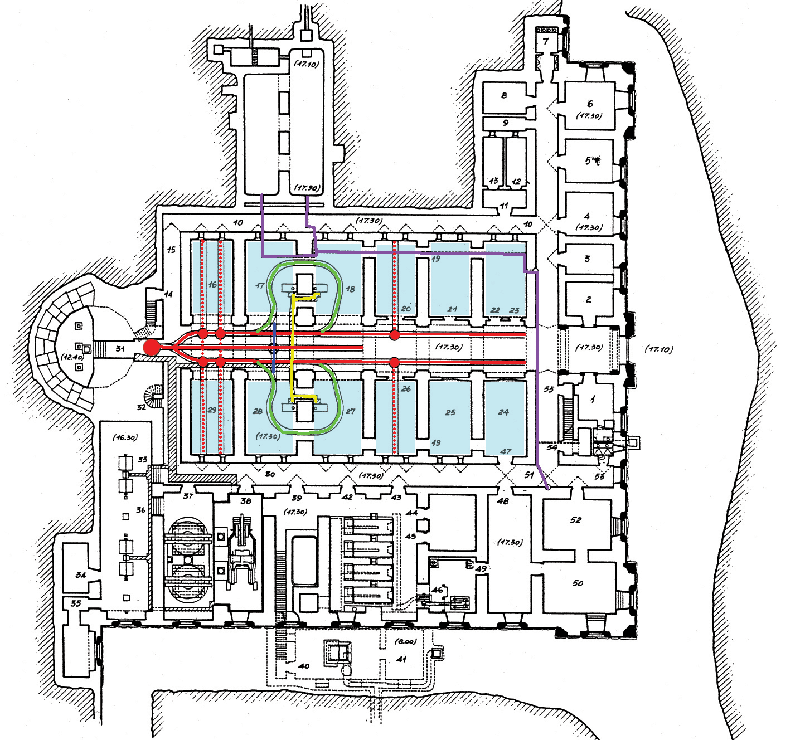 Penso che il sistema di binari e scambi sia per i proiettili che per le cariche di lancio siano quelli che ho colorato, ma sarebbe molto interessante capire meglio come funzionava questa splendida "macchina architettonica".