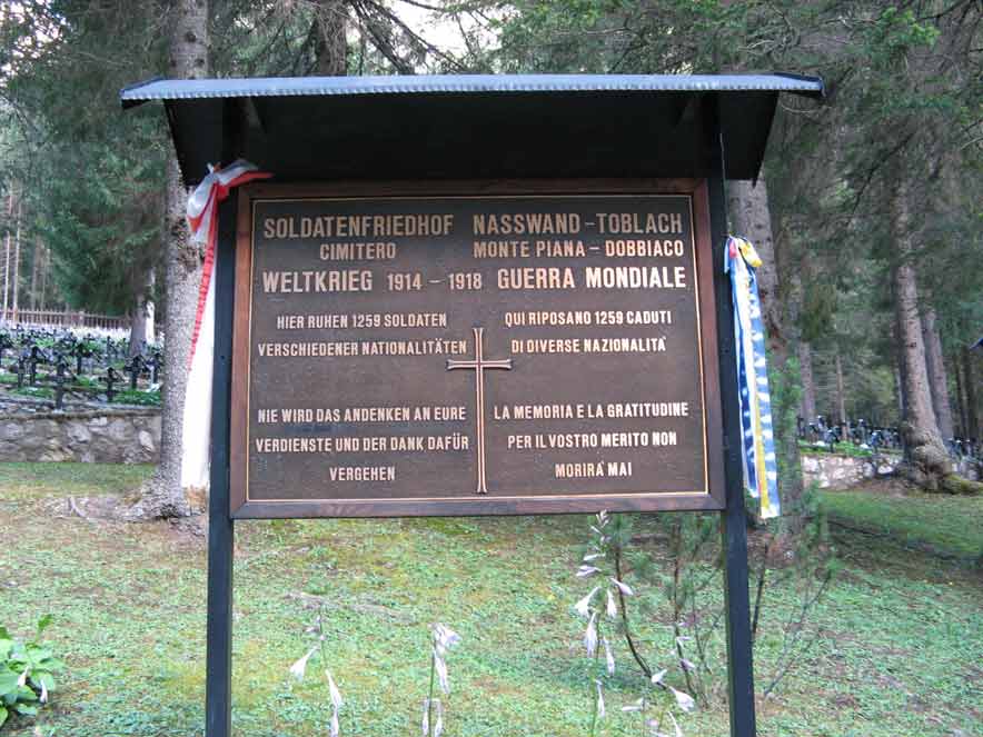 Posto le fotografie scattate al Cimitero Militare di Monte Piana-Dobbiaco ubicato sulla strada che congiunge Dobbiaco(BZ)e Misurina.Sono raccolte le spoglie di 1259 Caduti appartenenti alle varie nazioni che formavano l'Impero Austro-Ungarico.[ciao2]Gianfranco