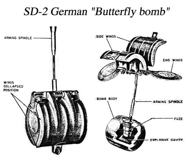 Ciao Blaster, no, le Bouncing Betty erano le S-Mine tedesche (S sta per spreng) le bombe a farfalla erano aviolanciate. Ne esitevano di due tipi, la prima fu la SD-2 Tedesca (lanciata in contenitori cluster)