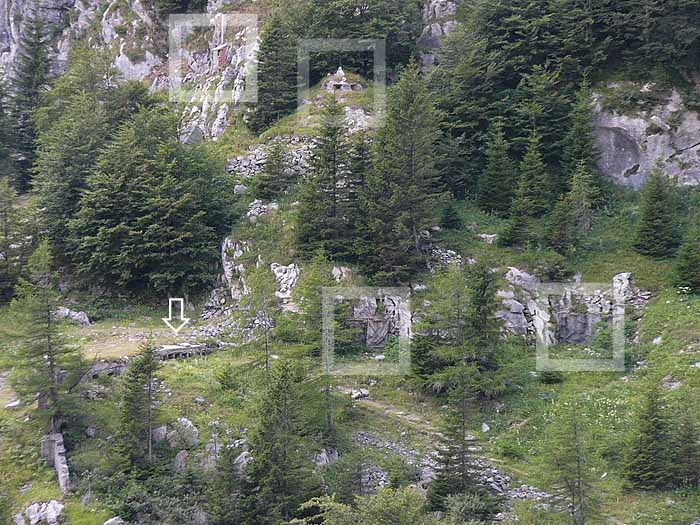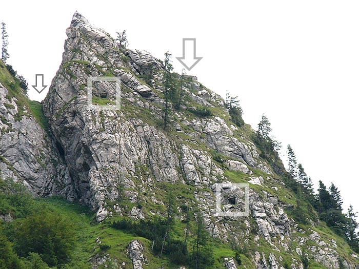 Qui vediamo un'Opera aggrappata alla roccia con alcuni malloppi da me localizzati a vista, la freccia di SX localizza una delle entrate a me conosciute (che è sul verso opposto da dove è presa la foto: