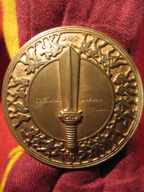Da poco recuperato grazie alla collaborazione dell'Amico Mal d'Africa,ecco un bel medaglione G.I.L. scudo del Duce in grado oro della ditta Senesi,apposto sulla "cravatta" cremisi e giallo,tipica delle divese della G.I.L.(come da regolamento sull'uniforme)