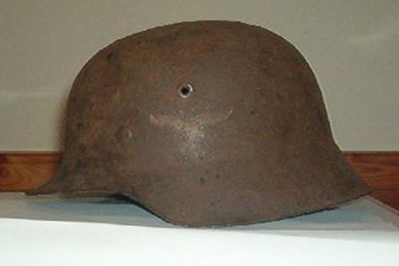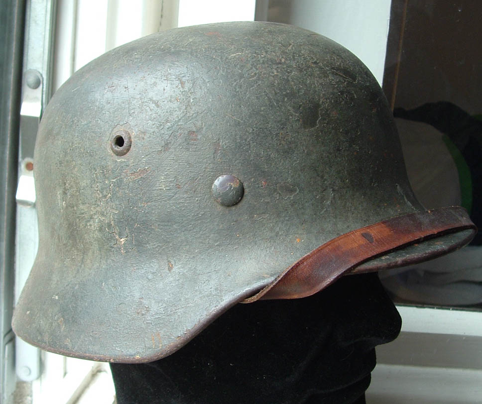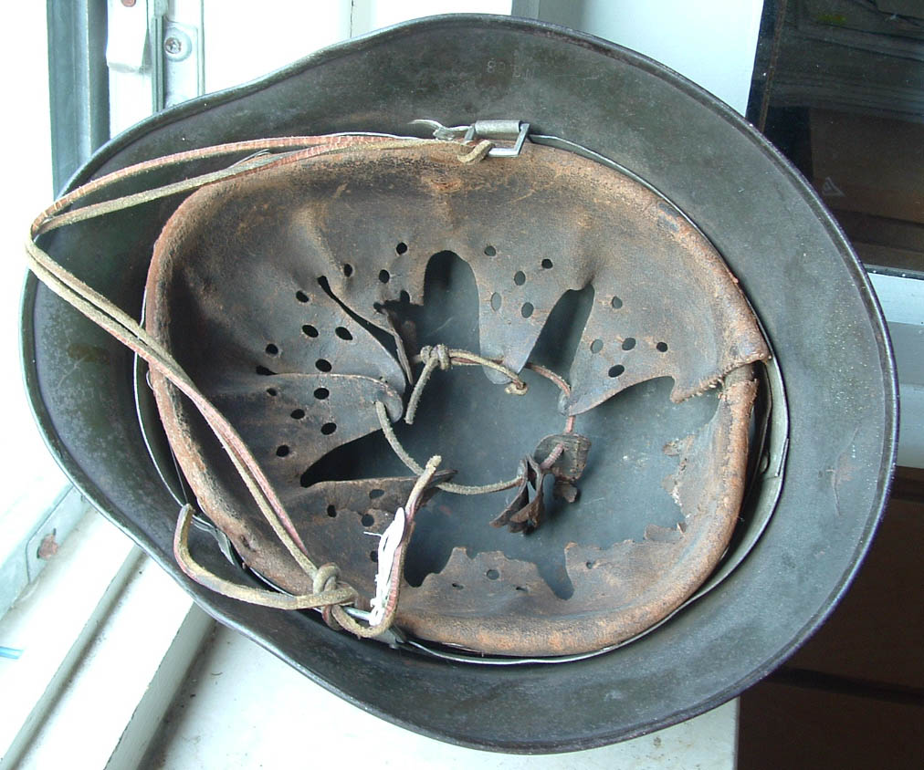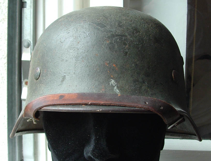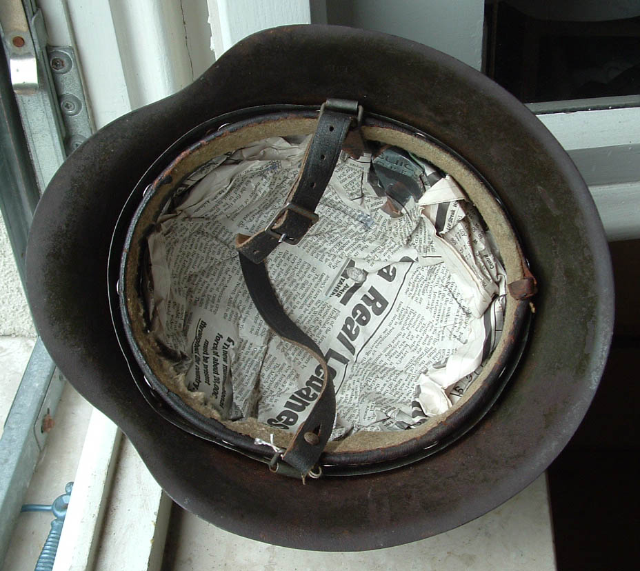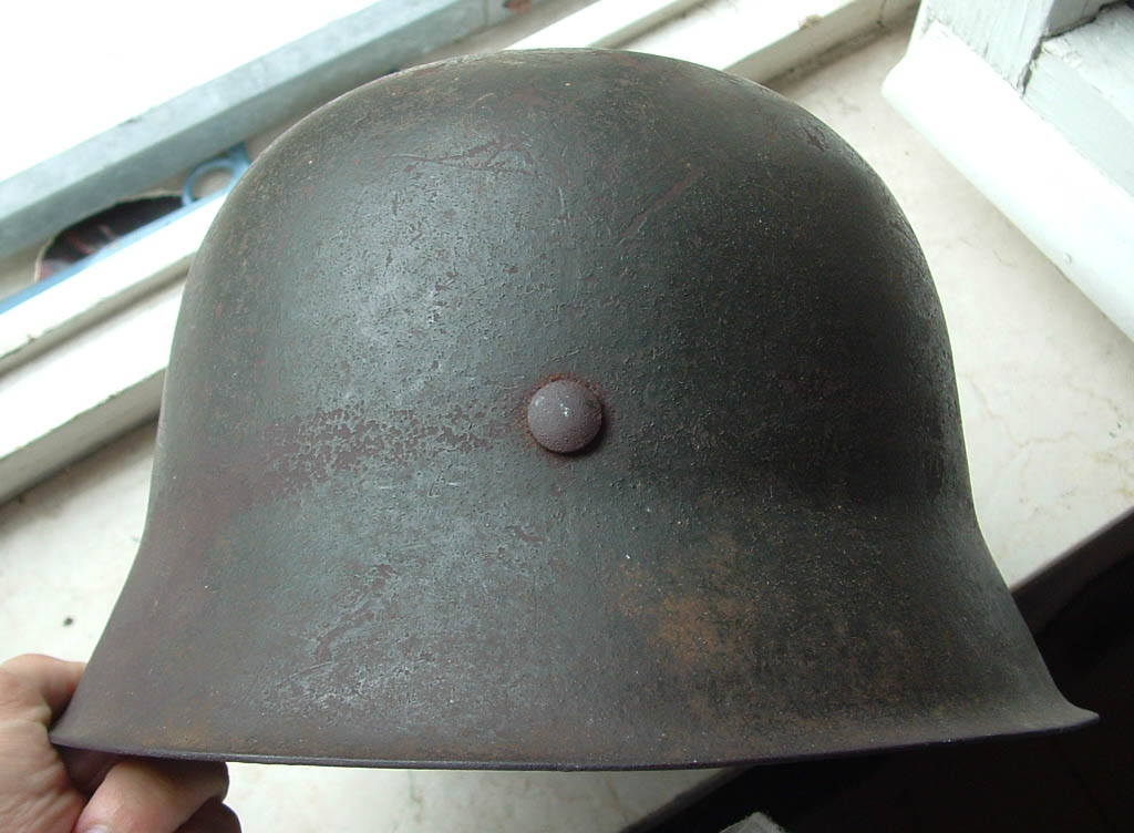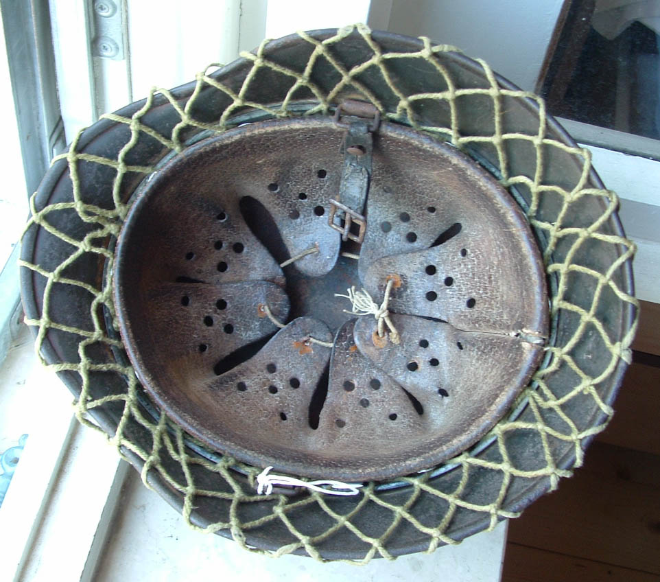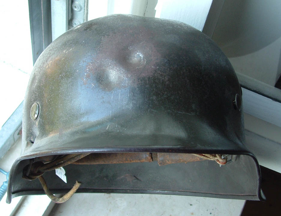 questo è stato il mio primo elmo tedesco, non è speciale ma proprio per quanto detto non ho mai pensato di cederlo, per prenderlo ho risparmiai per un anno intero,e a 14 anni è molto difficile mettere da parte quello che a mie occhi era un "capitale".......cmq è un modello 40 Quist con decal quasi del tutto scomparsa, l'interno è abbastanza secco e anche del soggolo rimane ben poco, però almeno e un elmo genuino, la rete la misi io ed è americana ww2