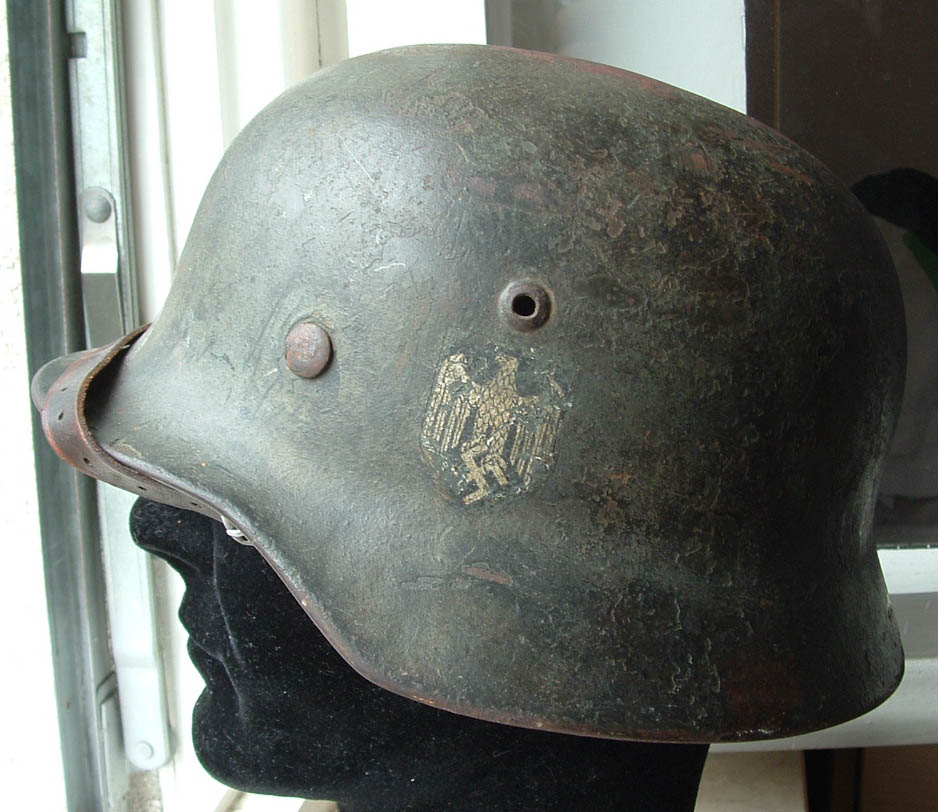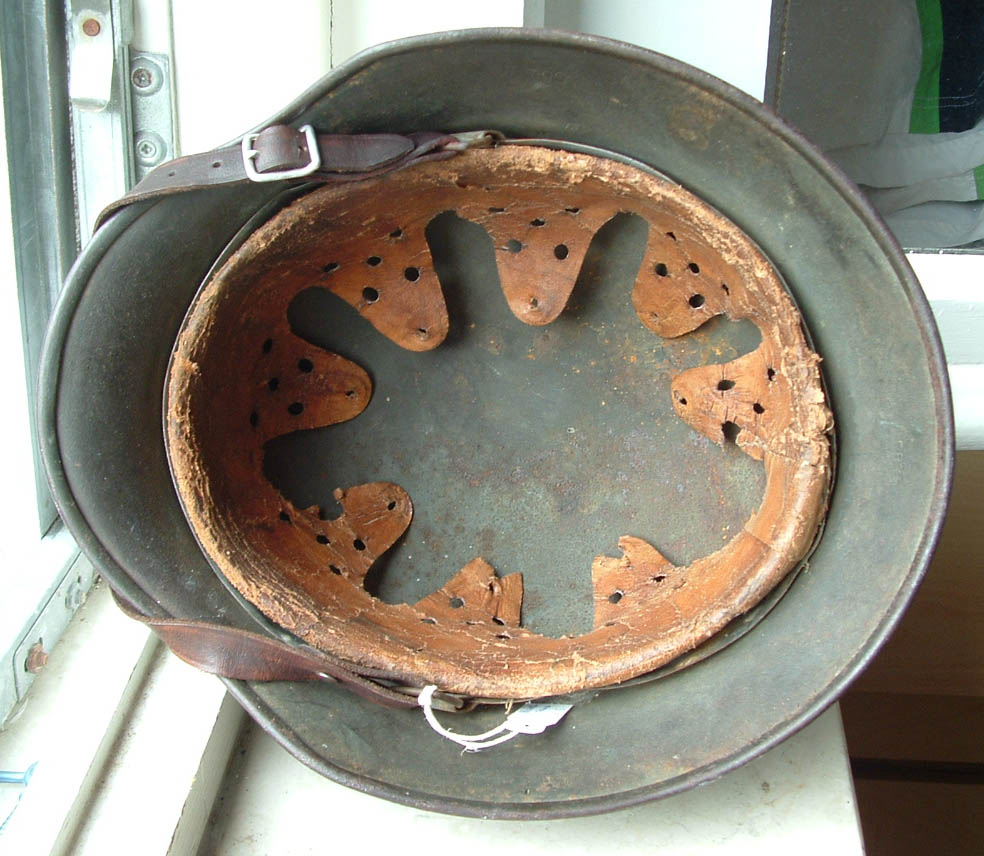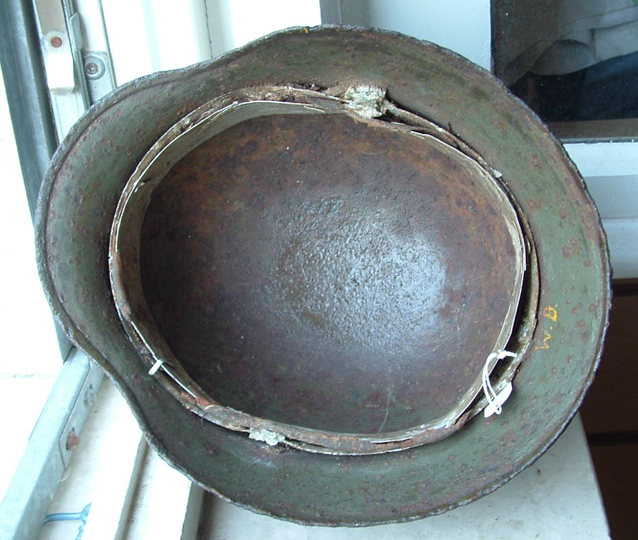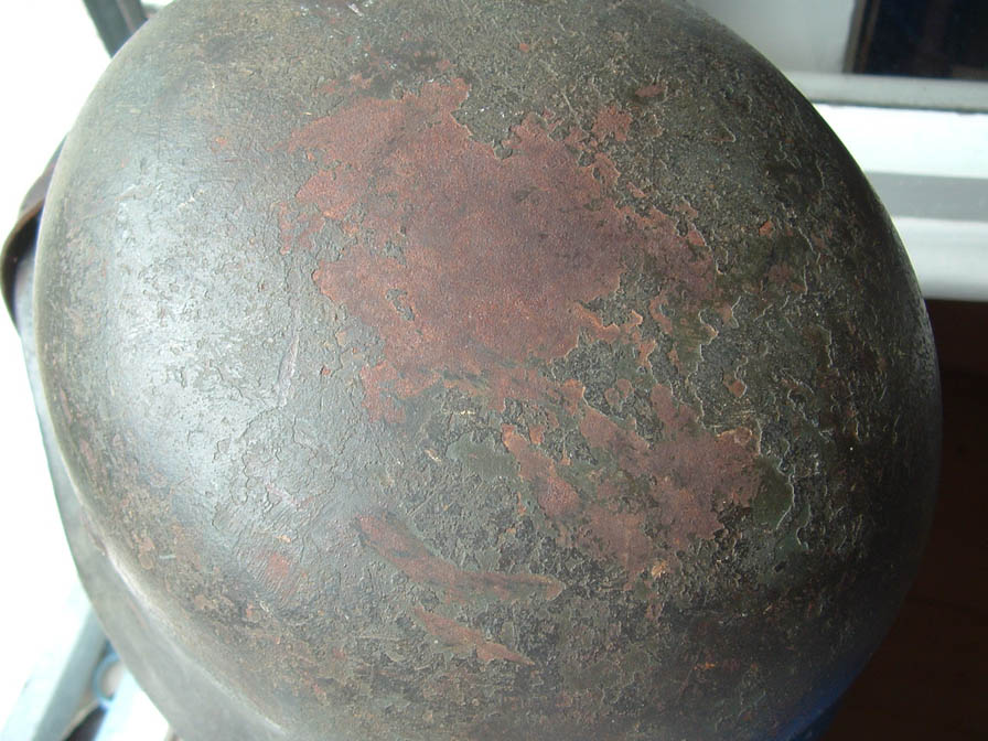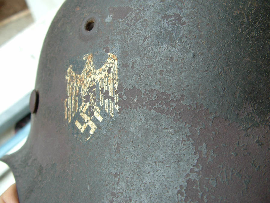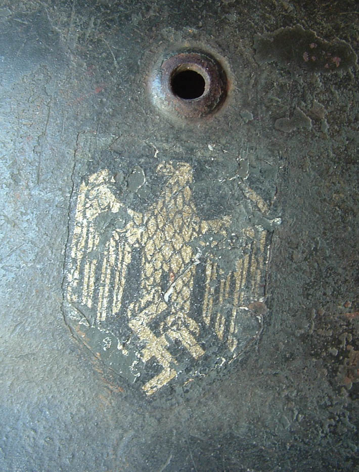 m35 proveniente di scavo dalla Francia ma sfortunatamente non ricordo con precisione il luogo del ritrovamento, insieme all'elmo è stato rinvenuta la gavetta con le posate, una parte del cinturone con la fibbia, vari parti di equipaggiamento, un distintivo assalto generico ed una baionetta, presumibilmente appartenute tutte allo stesso soldato. questo elmo è stato prodotto nel 35 attenendoci al cerchio in alluminio primo tipo, la sua caratteristica oltre allo straordinario stato di conservazione se si pensa che è rimasto sepolto per più di sessanta anni sepolto, è che fu destinato in un primo momento per uso politico-civile con molta probabilità* in dotazione ai pompieri, infatti sotto lo scudetto tricolore vi è una svastica in bianco si grandi dimensioni, mentre sotto l'acquila uno scudetto nazionale ma posizionato con le stricie verticali e non oblique, poi successivamente dato in dotazione all'esercito e quindi ridecallato con le tipiche insegne heer, ho fatto una piccola ricerca online e ne ho trovato uno identico al mio sono in condizioni ottime ma differente solo per la cronologia di utilizzo che risulat invertita(elmo prima in dotazione all'esercito e poi ai pompieri)credo questo pezzo molto interessante per questa caratteristica e per lo stato di conserzione anche se dell'interno non è rimasto quasi niente apparte le iniziali e la terra ben compatta e dura tra il cerchio ed il guscio.......a voi i commenti e le considerazioni sempre ben graditi