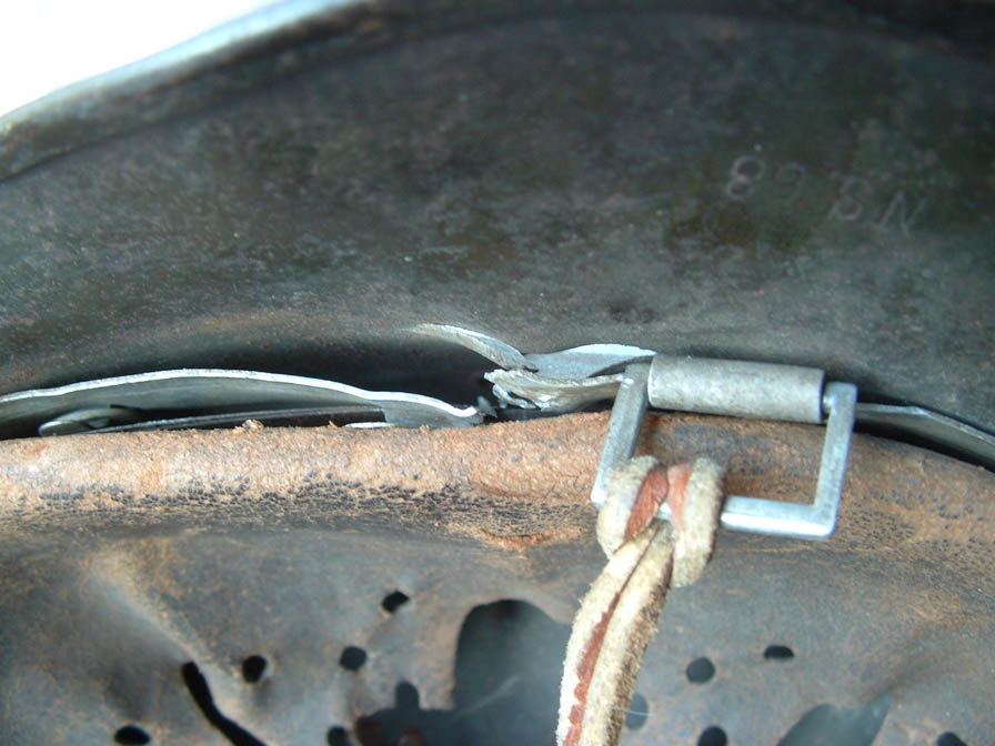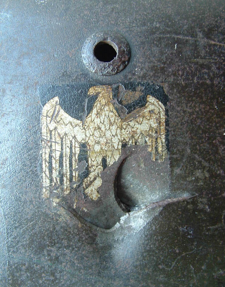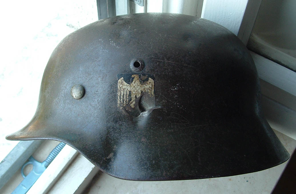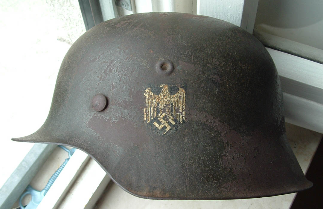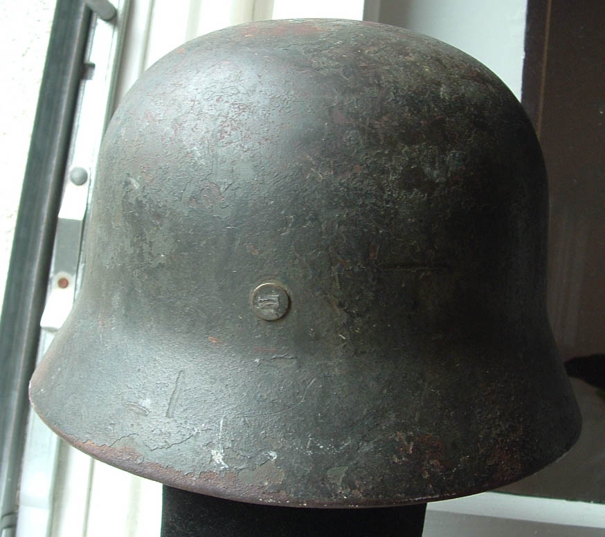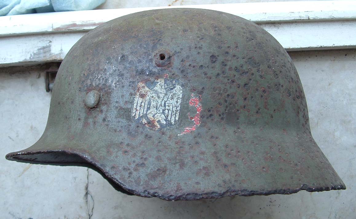 m35 proveniente di scavo dalla Francia ma sfortunatamente non ricordo con precisione il luogo del ritrovamento, insieme all'elmo è stato rinvenuta la gavetta con le posate, una parte del cinturone con la fibbia, vari parti di equipaggiamento, un distintivo assalto generico ed una baionetta, presumibilmente appartenute tutte allo stesso soldato. questo elmo è stato prodotto nel 35 attenendoci al cerchio in alluminio primo tipo, la sua caratteristica oltre allo straordinario stato di conservazione se si pensa che è rimasto sepolto per più di sessanta anni sepolto, è che fu destinato in un primo momento per uso politico-civile con molta probabilità* in dotazione ai pompieri, infatti sotto lo scudetto tricolore vi è una svastica in bianco si grandi dimensioni, mentre sotto l'acquila uno scudetto nazionale ma posizionato con le stricie verticali e non oblique, poi successivamente dato in dotazione all'esercito e quindi ridecallato con le tipiche insegne heer, ho fatto una piccola ricerca online e ne ho trovato uno identico al mio sono in condizioni ottime ma differente solo per la cronologia di utilizzo che risulat invertita(elmo prima in dotazione all'esercito e poi ai pompieri)credo questo pezzo molto interessante per questa caratteristica e per lo stato di conserzione anche se dell'interno non è rimasto quasi niente apparte le iniziali e la terra ben compatta e dura tra il cerchio ed il guscio.......a voi i commenti e le considerazioni sempre ben graditi