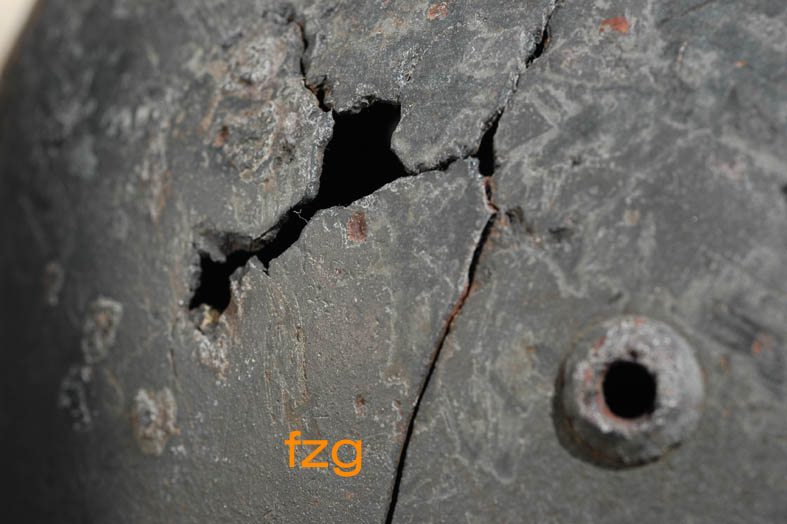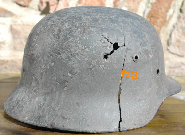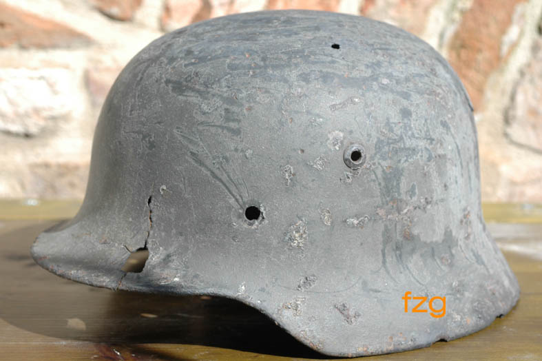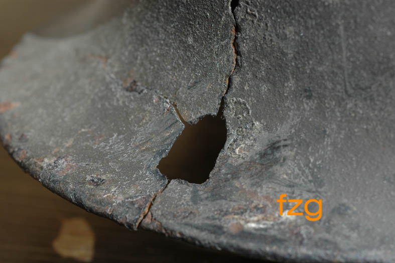 vi discpiace se continuo la saga???altro elmo di franz2 molto particolare perchè trapassato da schegge alcune delle quali per l'evevato calore si sono fuse con metallo stesso dell'elmo senza perforarlo, un'aspetto molto particolre di questo pezzo è anche che il guscio è praticamenete leggerissimo, come se l'alto calore e le scheggie abbiano alterato la composizione stessa del metallo, quando il mio amico lo prese c'era ancora una grossa radice che correva sotto il bordo della ribattitura della falda!!!