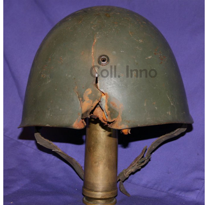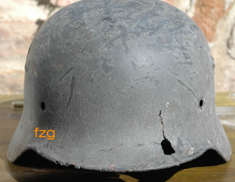 Verò,però danni così sono fatti da mitragliatrici o da mitragliette.Già* che ci sono contribuisco anche io con un elmo che ho in collezione.Al soldato quella volta andò bene(suppongo fosse fuoco amico di rimbalzo,vedendo la forma del bozzo e la camiciatura che mi fanno propendere per un cal.45).