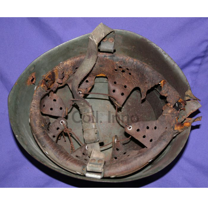 Guardate questo M1 che ho in collezione e che ho trovato personalmente.Ho formulato una mia ipotesi personale visto che ci sono sia fori di scheggia sia di proiettile.Probabilmente il proprietario è stato ferito od ucciso da una scheggia ed in seguito i suoi compagni hanno utilizzato l'elmetto mettendolo su di un fucile o su di un ramo per vedere se per caso i tedeschi stavano ancora sparando e per individuare l'eventuale direzione.
