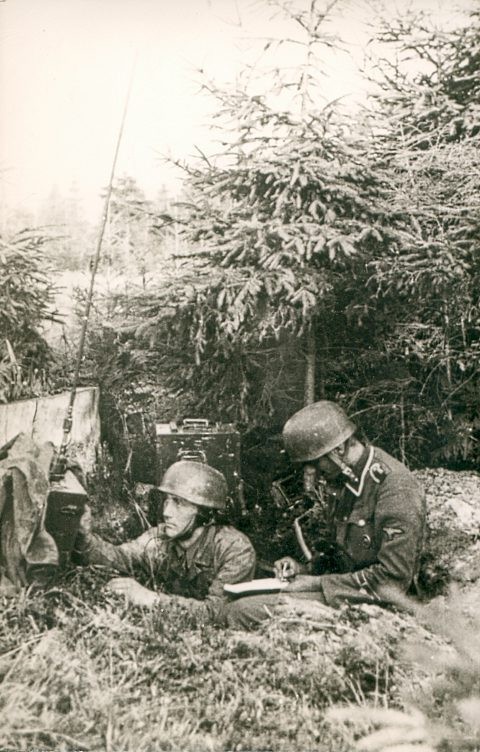 All'inizio, c'è anche il commentatore che li cita, si vedono due uomini in buca, uno con l'mg e l'altro con l'arma leggera, si vedono i tipici elmi FJ.
