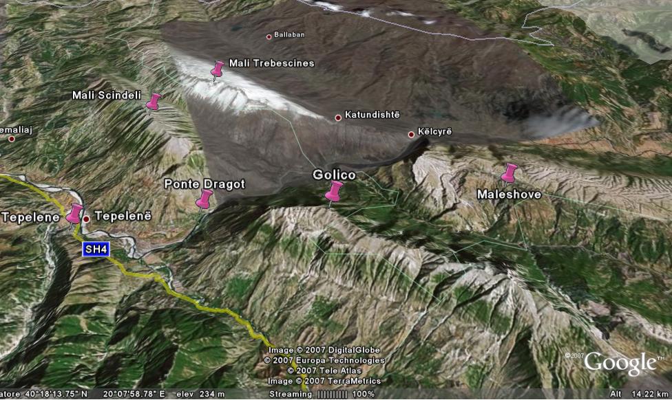 Ho risolto il "mistero del fiume"[^]: se guardi la prima immagine che ho postato in questa pagina, noterai che ai piedi del Golico c'è la confluenza di due fiumi, quello che proviene da est (e quindi passa sotto Ponte Dragot) è la Vojussa, quello che proviene da sud (e quindi prima passa da Argirocastro) è il Drinos, l'unico problema è che non so il nome del tratto finale, dopo la confluenza, cioè devo capire se è la Vojussa che si getta nel Drinos o viceversa.