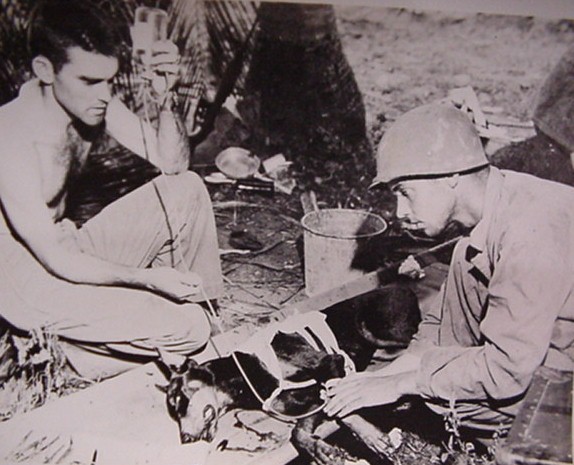 Doberman USMC ferito nel pacifico e amorevolmente assistito.
