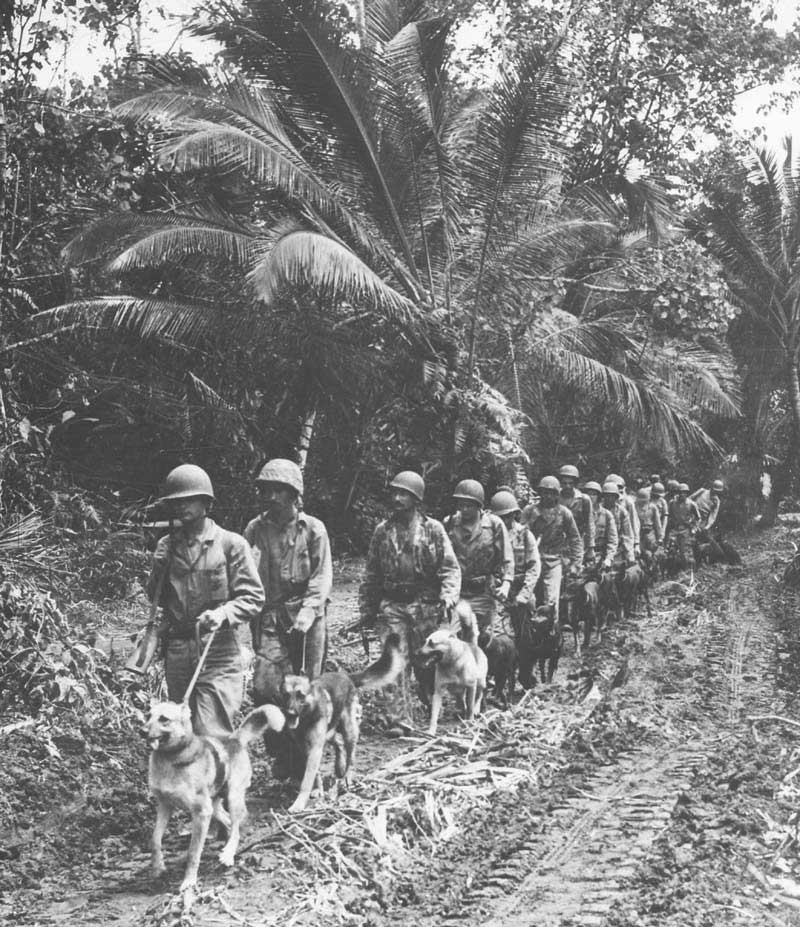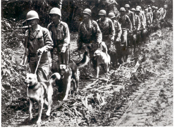 <font color="navy">A Guadalcanal gli americani sbarcarono 10.000 "marines". I giapponesi cercarono invano di riprendere l'isola e l'aereoporto finchè furono ricacciati nella giungla dove vissero mangiando radici.Pattuglia americana con cani alla ricerca del nemico.</font id="navy">