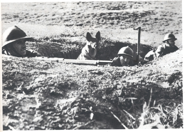 <font color="navy">Una pattuglia di esploratori al riparo in una buca fatta dallo scoppio di un obice d'artiglieria. Il cane è impiegato per mandare messaggi ai comandi.</font id="navy">
