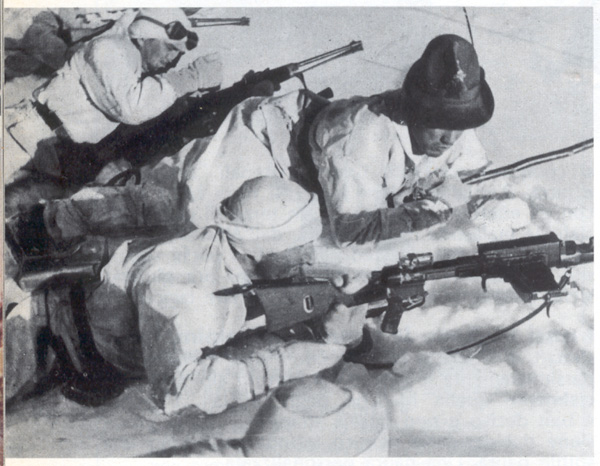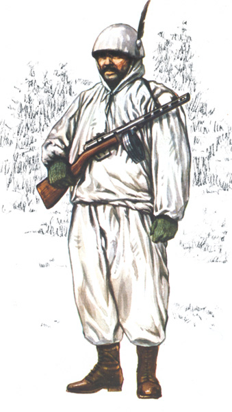 Figura di un alpino del battaglione Monte Cervino con un PPSh russo raccolto sul campo di battaglia, molto apprezzato dalle truppe al fronte per la sua affidabilità* e potenza di fuoco che sviluppava