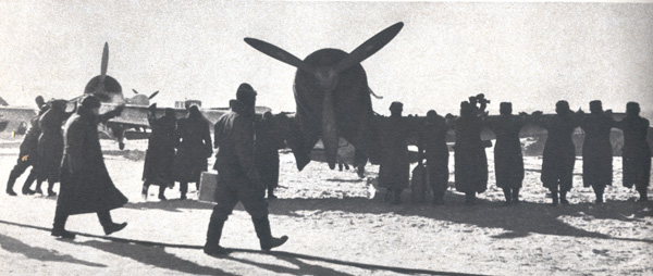 Nella foto a sinistra un rudimentale e ingegnoso sistema per immettere aria calda (già* precedentemente postato)nei motori del caccia Macchi 200, a destra specialisti al lavoro per mettere in moto un S-81