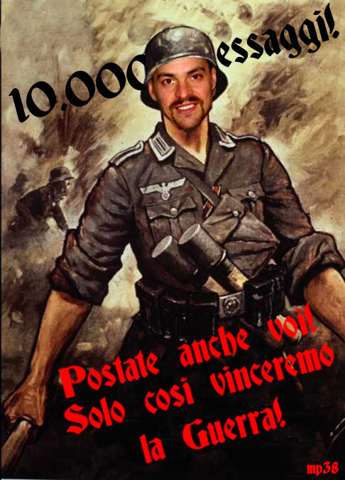 Certo che se pubblicavano un volantino del genere gli Alleati si spaventavano proprio!!!Magari il volantino poteva recitare:"Arruolati anche tu nella Legione Mulon!Ti verrà* consegnato un equipaggiamento mint,ti verranno forniti i generi di sussistenza in brotbeutel,gavette e borracce monomatricola.Richiesto come giuramento di fedeltà* il tatuarsi il viso di Gianmint Monomatricola sul cuore".