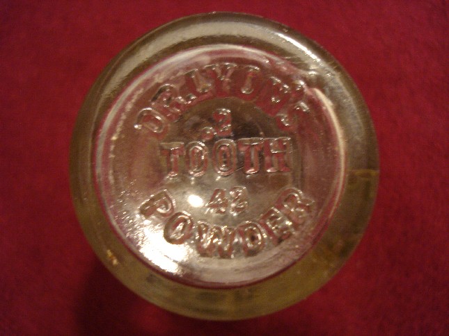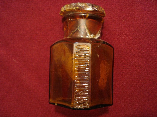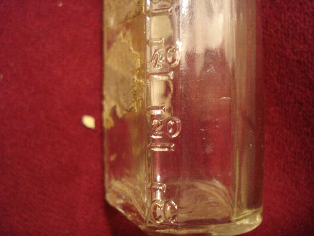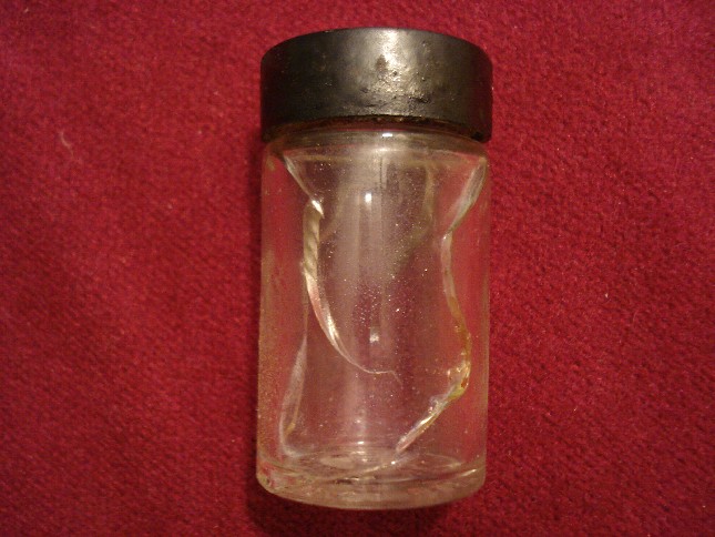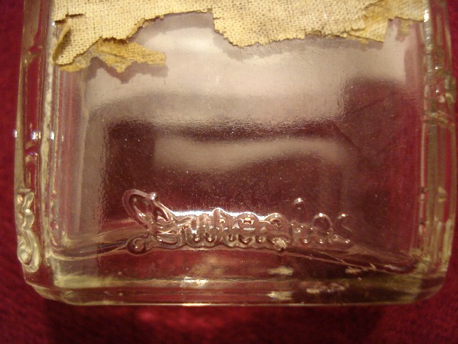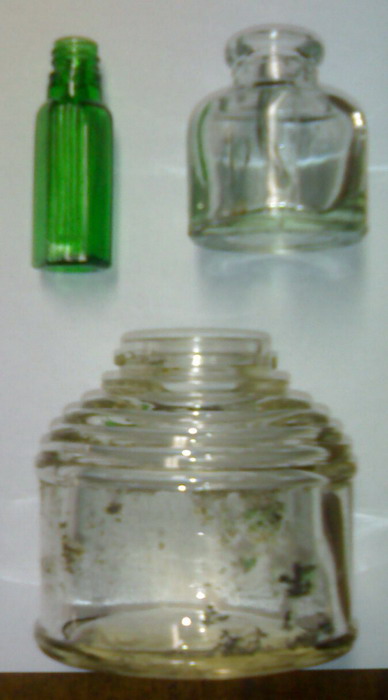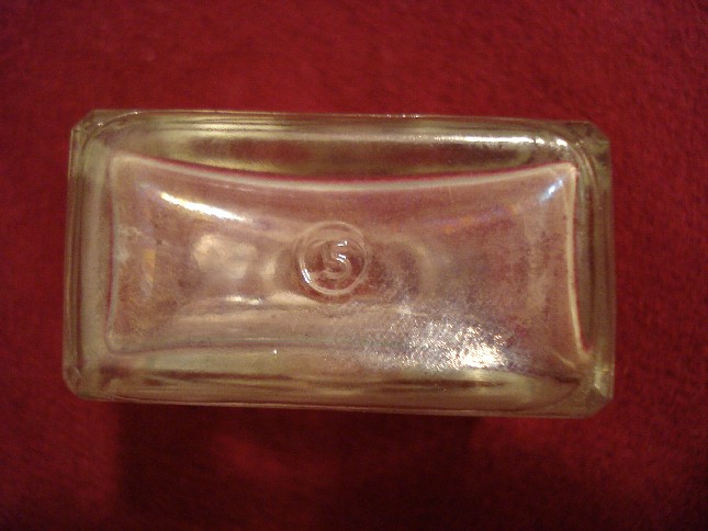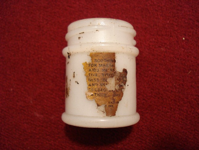 In mezzo a tutte queste bottigliette c'era anche questo vasetto, credo sia americano perchè sul fondo compare la scritta PAT D che si trova anche sulle bottiglie di coca cola prodotte dal 1938 al 1951.Però non conosco il contenuto..