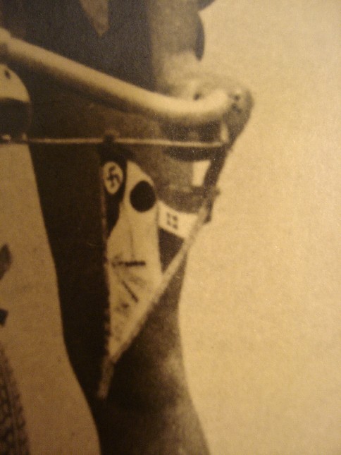 Notate il particolare della bandiaerina appesa al manubrio della bicicletta, si intravede la svastica, la bandiera Giapponese e la bandieta Italiana con stemma sabaudo.