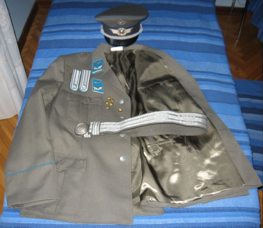 La foto è uno schifo ma ecco la mia giacca ex-DDR con cappello e cintura da parata. E' nuova di fabbrica, non sono neanche mai stati applicati gli accessori, che tengo in una tasca ancora sfusi!
