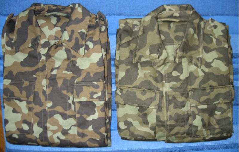 Queste sono due mimetiche sovietiche degli anni '80-'90. Sono identiche nella fattura tranne nel colore, una è più tendente al marrone mentre l'altra al verde.
