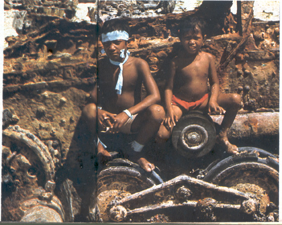 E per sorridere un pò una foto scattata tanti anni fa (almeno per me) a Betio dei due abbronzatissimi cocis (io sono quello più grande)e giulio sui resti di un mezzo americano [:81][:81][:81]