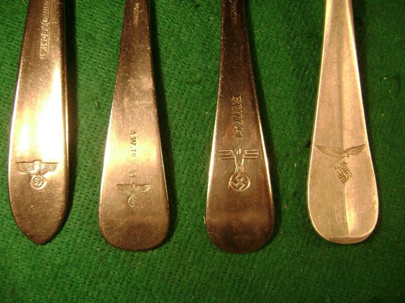 La posata n.4 (partendo da sinistra), quella in alluminio, ha un aquilotto della Luftwaffe, per quello la testolina è girata verso destra. La posata n.1 (sempre partendo da sinistra) secondo me è falsa, ma ripeto baso la mia impressione su ciò che dispongo a livello informativo e sulla mia esagerata passione per posatame e stovigliame krukko. Cosa che si intuisce anche dalle foto che ho messo nel topic sulle postazioni "di comando" domestiche.