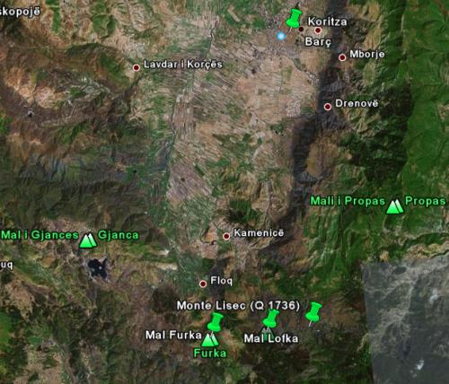 Da Google Earth, ho evidenziato la città* di Koritza, il Mal Lofka, il Mal Furka ed appunto il Mal Lisec (anche se quest'ultimo non è indicato dal programma.