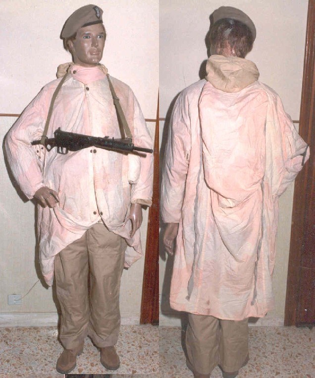 e l'appiccicaticcio si sciolse, e rimase solo la parte di stoffa del capo antigas, che assunse un colorazione bianco/rosa !Cosa si invento'?Comincio' ad offrire ai vari collezionisti in Europa e nel mondo dei 'poncho mimetici da deserto'.Ci cademmo in parecchi (per fortuna non spendemmo piu' di una trentina di mila lire d'allora), ma fa' rabbia pensare che quelli erano dei capi mimetici originali britannici,ridotti in quel modo per colpa di un imbecille. Questo e' l'aneddoto. Il capo antigas originale, l'ho poi trovato in seguito, ma al costo di 5 volte tanto.All'epoca scattai delle foto di questo capo 'rovinato' ambientandolo con una vera uniforme del SAS. Si presentava bene, ma ahimé era un falso storico. [self]PaoloM