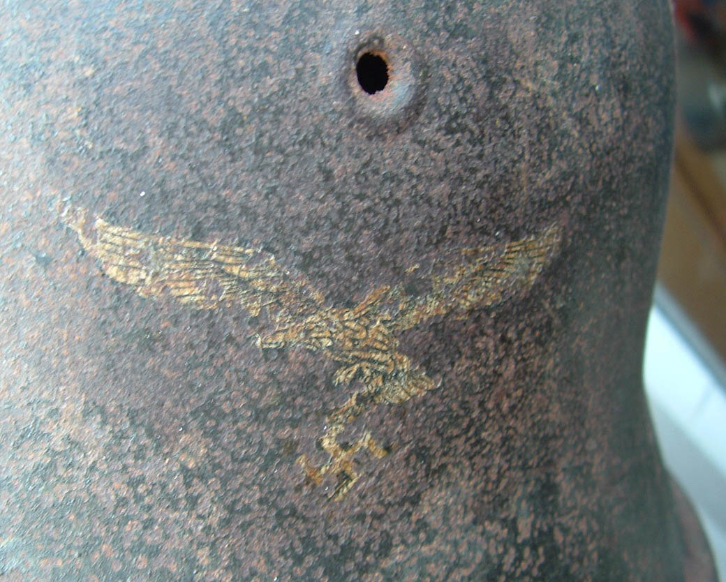 questo è uno dei miei ultimi acquisti e proviene dagli stati uniti, è un classico elmo m42 luftwaffe et62 che è rimasto dimenticato per un lunghissimo periodo in una cantina e quindi non è mai stato in collezione prima d'ora, è in condizini discrete ma sfortunatamente la parte dove c'è la decal è più rovinata, perchè era quella coi cui l'elmo era appoggiato su qualcosa, però non è proprio malaccio, cioè a me piace
