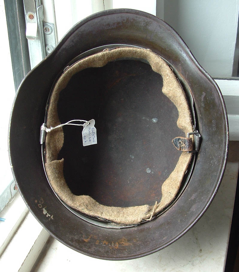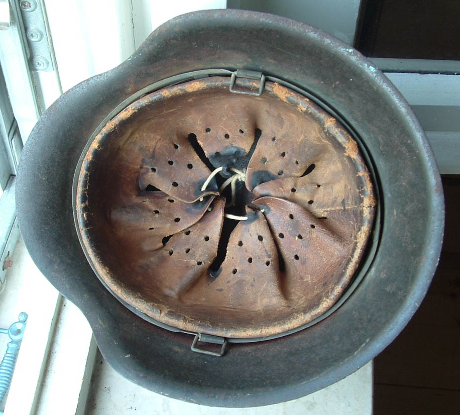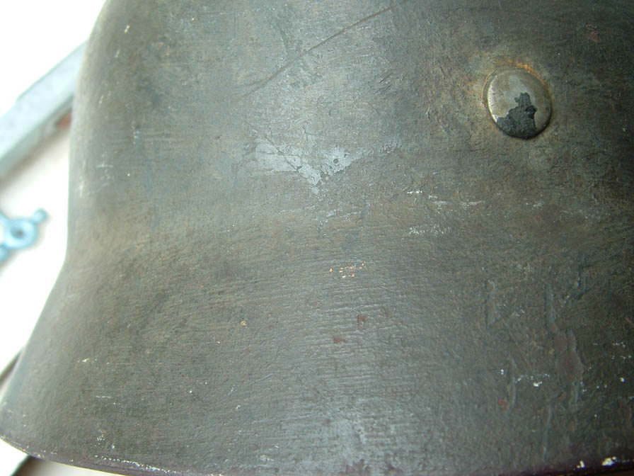 visto che siamo in tema posto quest'altro elmo che ho in collezione, non è proprio un relic anche se nelle condizioni in cui si trova possiamo definirlo "semirelic", si tatta di un modello 35 prodotto nel 39 stando ai marchi riportati sul soggolo e sul cerchione in alluminio con rinforzi, presenta ancora abbastanza tracce di un mimetismo in due tonalità* prevalenri un giallo sabbia e un verche chiaro anche se in alcuni punti si nota un'altra tonalità* tendente al marrone rossiccio, l'elmo è un pò storto perchè ha subito un forte colpo sulla falda sinistra, la cupola è completamente corrosa e dell'inteno è rimasto poco ma questo elmo credo proprio che il campo di battaglia lo abbia vissuto..........