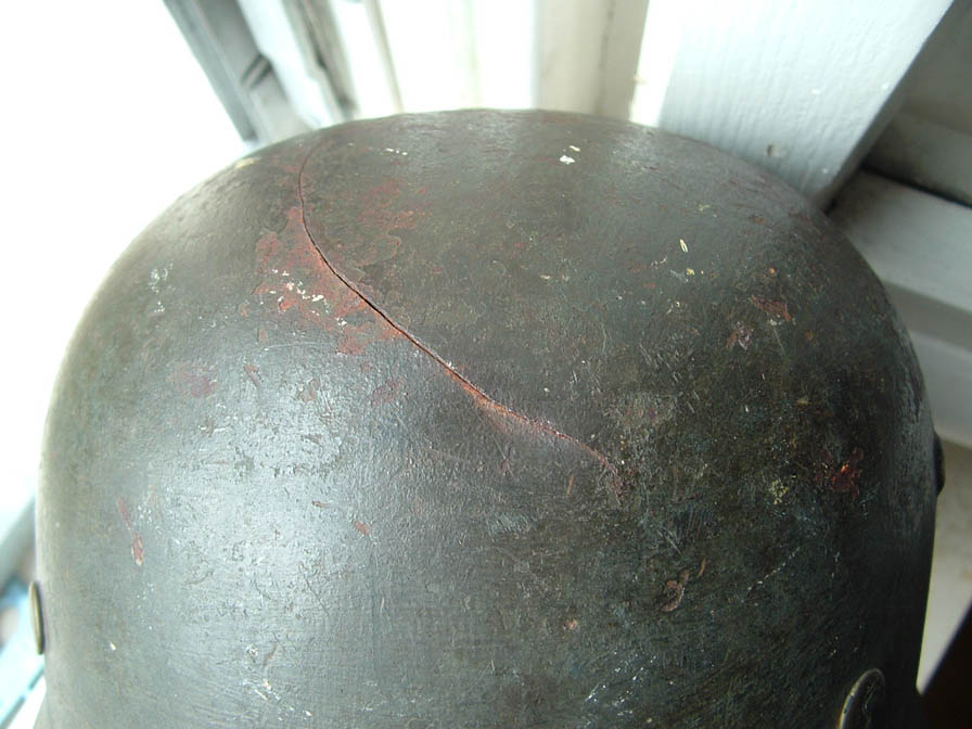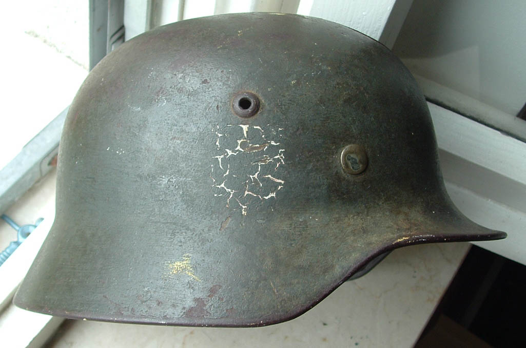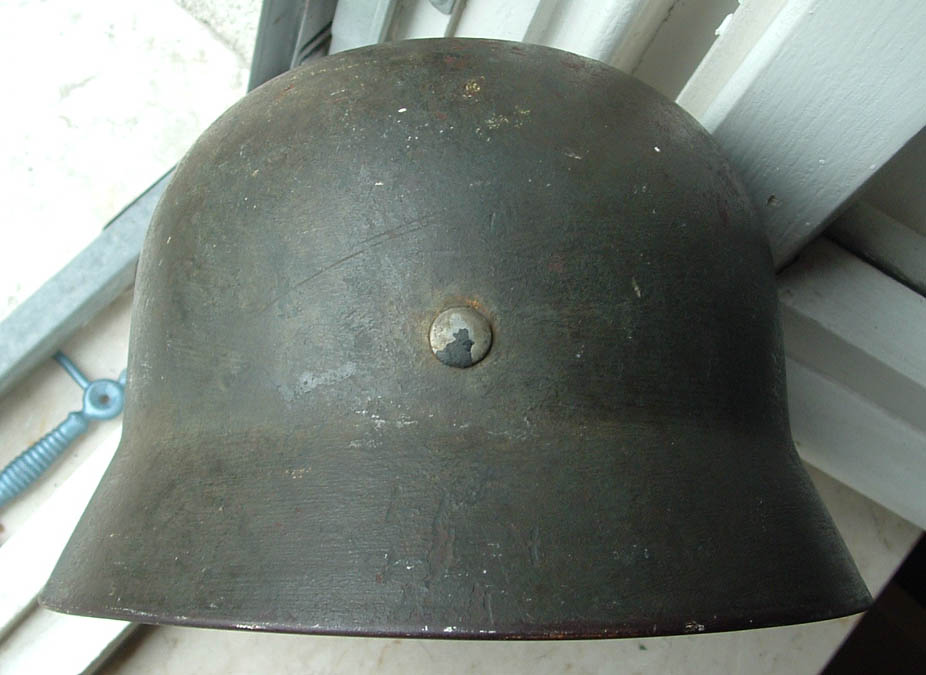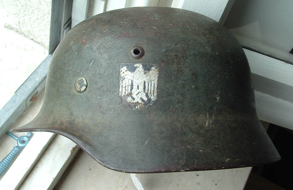 elmo m35 prodotto da Quist taglia 62 cerchio primo tipo senza rinforsi marcato 37, sulla falda è visibile ma con una certa difficolta di comprensione il nome del soldato che lo ebbe in dotazione, lo scudetto nazionale si vede sotto la vernice data a pennello per adattarlo al regolamente del 40 e si conserva con una bella patina, frontalmente è presente una fessura sulla cupola cretasi per un colpo violento ricevuto, la decal è una classica "big foot", l'elmo proviene dagli stati uniti come molti che ho in collezione non è completo ma è sempre un bel pezzo a mio parere