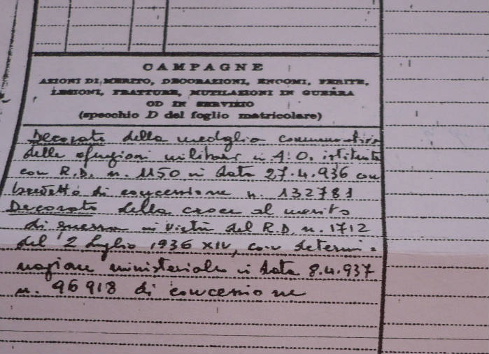 Nota (2)[:21]Partecipa alla Campagna in AO e questo gli permette di guadagnarsi una CMG e la Medaglia commemorativa per operazioni in AO (con gladio), come riporta lo specchietto del post di mariob.
