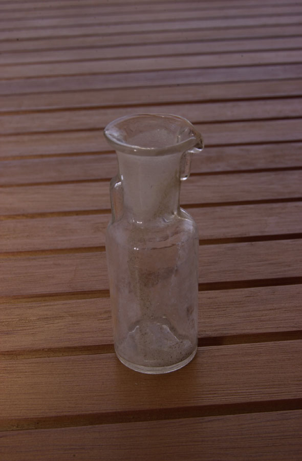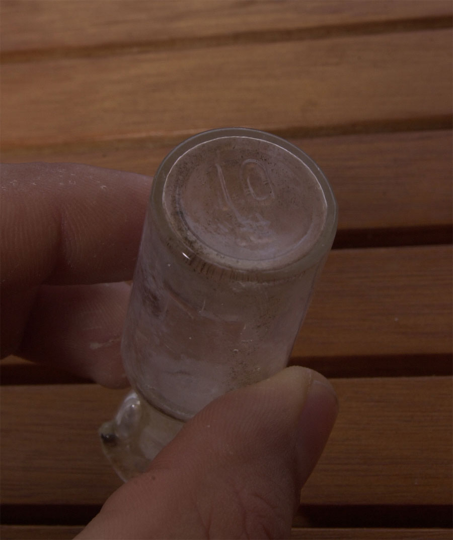 Bottiglina da farmacia, credo, ben fatta. Marchiata sul fondo con 10 e marchio illegibile.