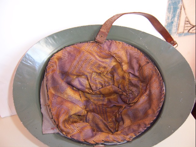 Questo è il mio: sembrerebbe realizzato in cartone pressato ricoperto di tela, l'imbottitura è montata su un cerchione di alluminio che a sua volta è fissato alla calotta tramite gli sfiatatoi d' aerazione in ottone.