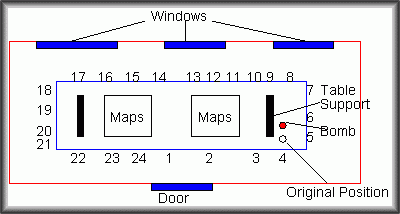 Planimetria della stanza dell'attentato con i posti a sedere occupati da ogni singola persona presente al momento dell'esplosione -