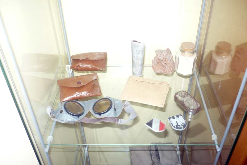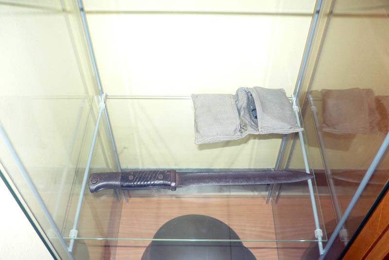 un ripiano mezzo vuoto con una baionetta e un porta occhiali in canapa e sotto l elmo spagnolo