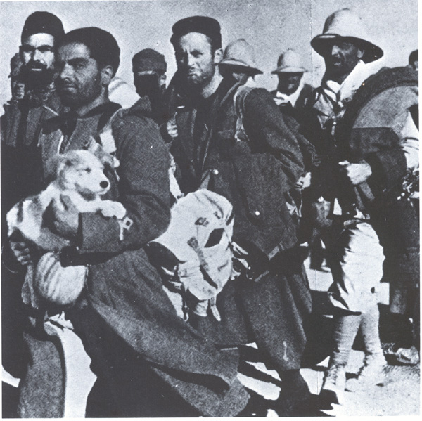 Un gruppo di fanti e di camicie nere in marcia verso i campi di prigionia in testa al gruppo un sottotenente delle camicie nere porta in braccio la mascotte del suo reparto.