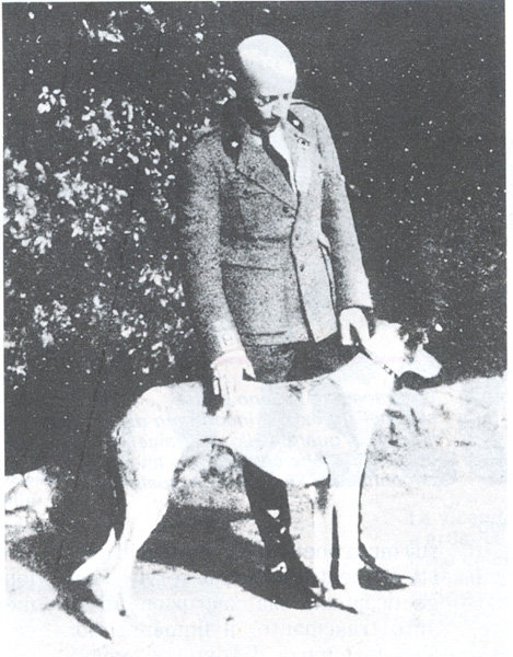Il "Comandante" in divisa di tenente colonnello nel parco della sua residenza fiumana insieme con uno dei suoi levrieri.